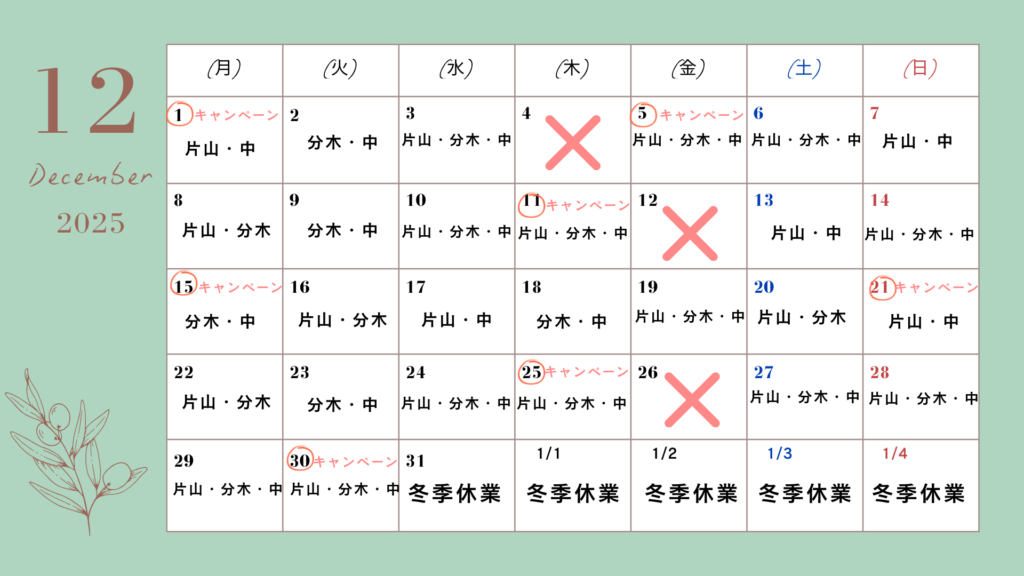 12月の営業日とスタッフ出勤日をお知らせいたします✨